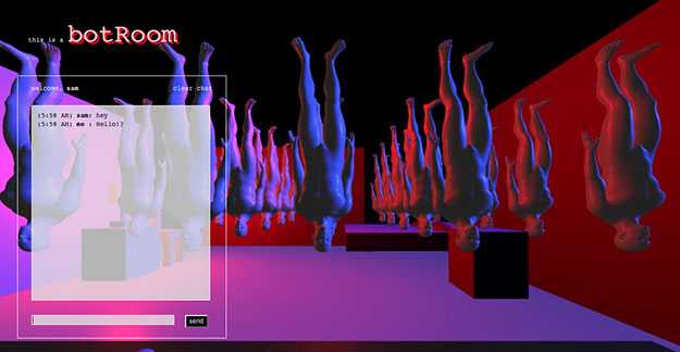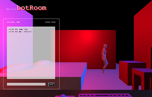 The idea behind the botRoom is that the online visitors are entering a website on which they think they have control on but they actually do not. This chat room is dominated by bots that are personified by artificial agents filmed from a webcam in their virtual world. The users are then interacting purely with an interface. Moreover the interface has control over them by imposing a role on them. This demo exhibits an interface that tries to convince the visitors that they are the “weird creepy strangers” of the chat room. Contrary to Chatroulette, the user cannot decide what they are looking at, the “next” button doesn’t exist here. This remake therefore critiques the speed to which one refuses interaction with others, a popular format in social media these days.