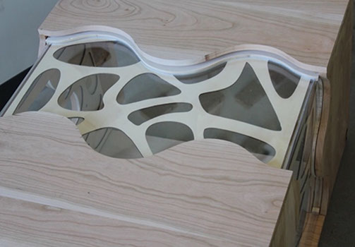 The table elongates and shortens when both sides of it are pulled out, it reveals a thin plexiglass river underneath with cracked riverbed made from laser-cut plywood.