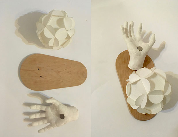 Hands On is an interactive nightlight designed to cultivate an emotional attachment with the user. Designed for disassembly using repurposed materials, Hands On tackles the idea that we could become more attached to an object that looks inherently human, especially if it replicates the user themselves. Using a battery operated reed switch circuit, this nightlight is turned on and off by placing the ball in the plaster hand. Fabricated using the alginate lifecasting method, Hands On asks: would you put part of yourself in the garbage?