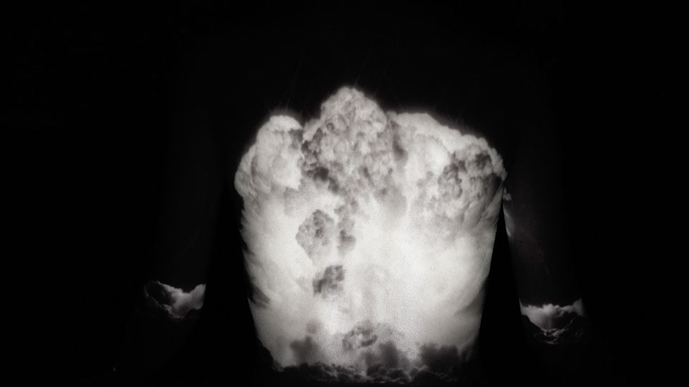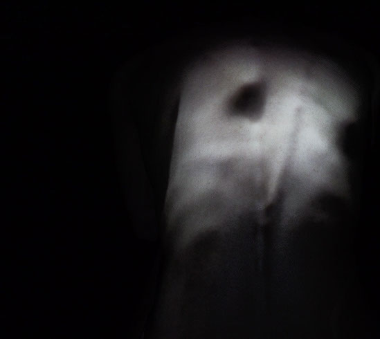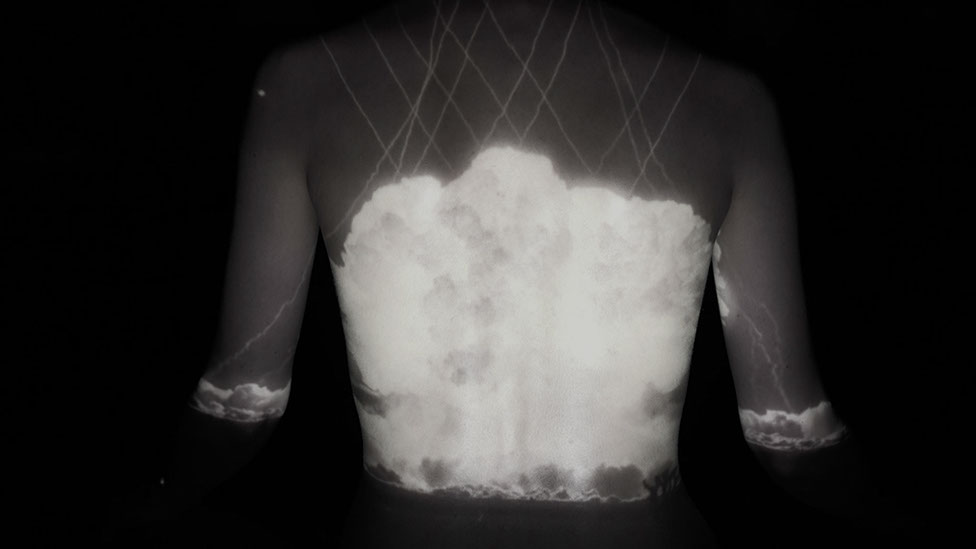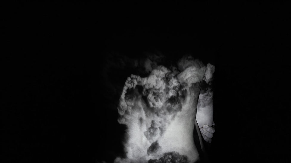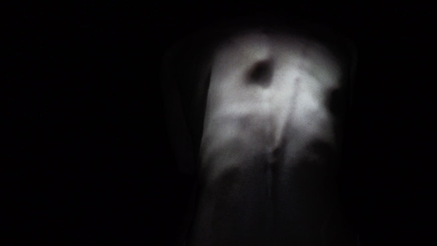Immersed within the steady sound of a Geiger counter, this single-channel video proposes a near-future body as one that has internalized nuclear destruction and radiation. With the visual effects captured entirely in real time, I AM BECOME uses video projections to situate humanity as both victim and perpetrator of nuclear devastation. Creating subtle and uncanny bodily disfigurement by projecting images of the body onto the body itself, the piece seeks to explore the ways in which humanity is imaging a world articulated through catastrophe.