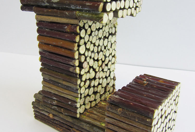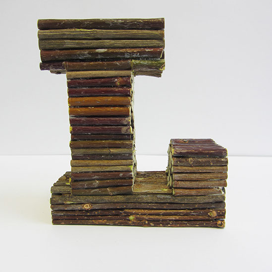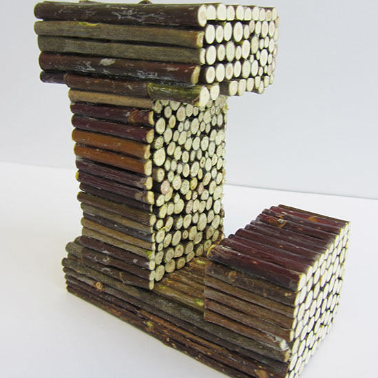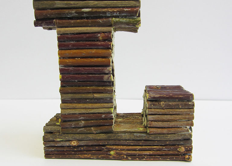 For this project, I wanted to work with the rigidity and clean-cut angles of the letter L. Having this in mind, I picked a serif font and used wood to reflect my vision. I chose to use tree branches from my front yard. As for the construction, I used MDF wood as a base and glued every branch piece by piece according to their thickness and shape. The whole process was basically a giant puzzle. This piece is supposed to give the illusion that I’ve cut a stack of branches into the letter L.