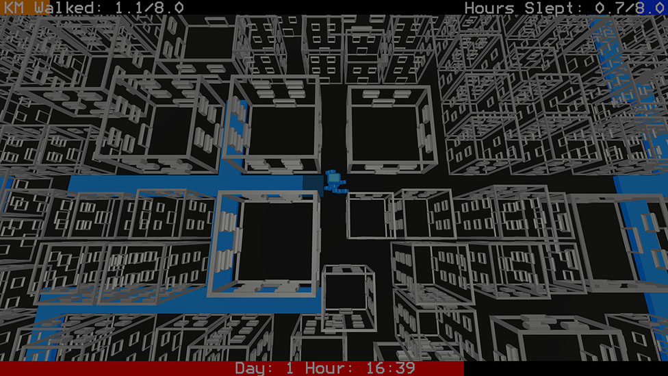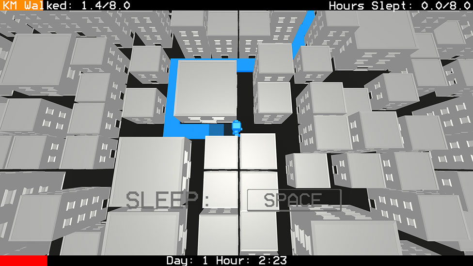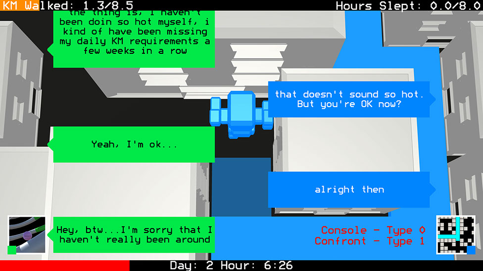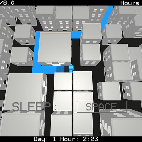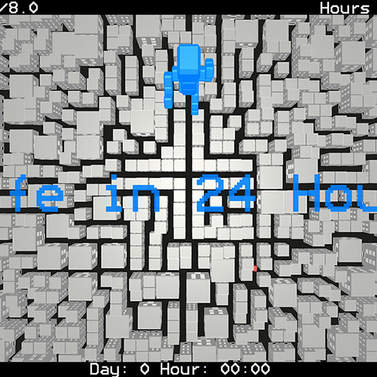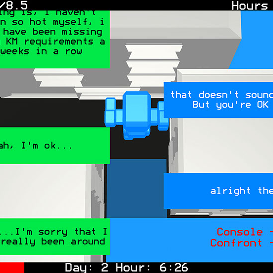 Life in 24 Hours is an endless runner-style video game designed to both subvert the “quantified-self” movement and express the emotional weight of digital relationships. In it, the player dashes a dystopian cityscape in which they are forced sleep and run a certain amount every day, all the while their friend discusses their worries with them through a disruptive messaging app. The resulting experience evokes how messaging can be both empowering and debilitating as the player attempts to balance their friend’s texts with their need to run and sleep.