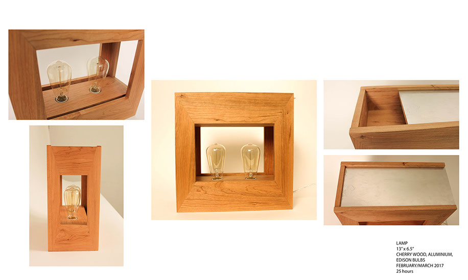A lamp has the ability to change the ambience in a room and change how people interact within a space. I have designed this lamp with the intention of it being put at the entrance of a house. It is made with cherry wood (finished with beeswax), aluminium and Edison light bulbs. The top of the lamp has a small storage area (the piece of aluminium slides in and out) to put keys or various other small objects.