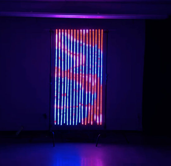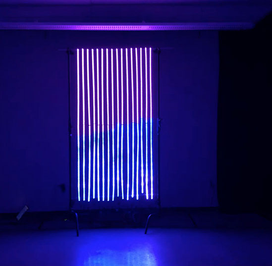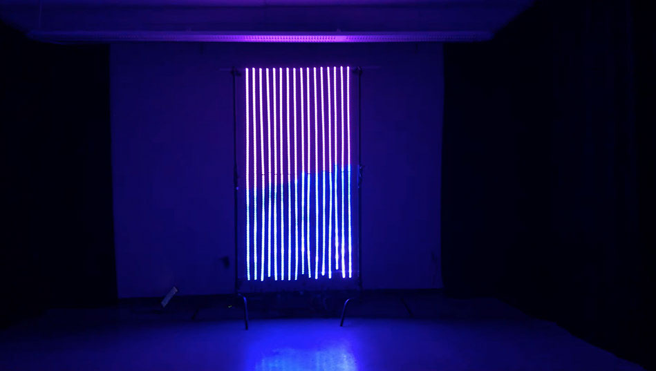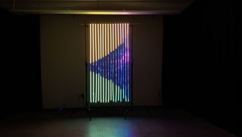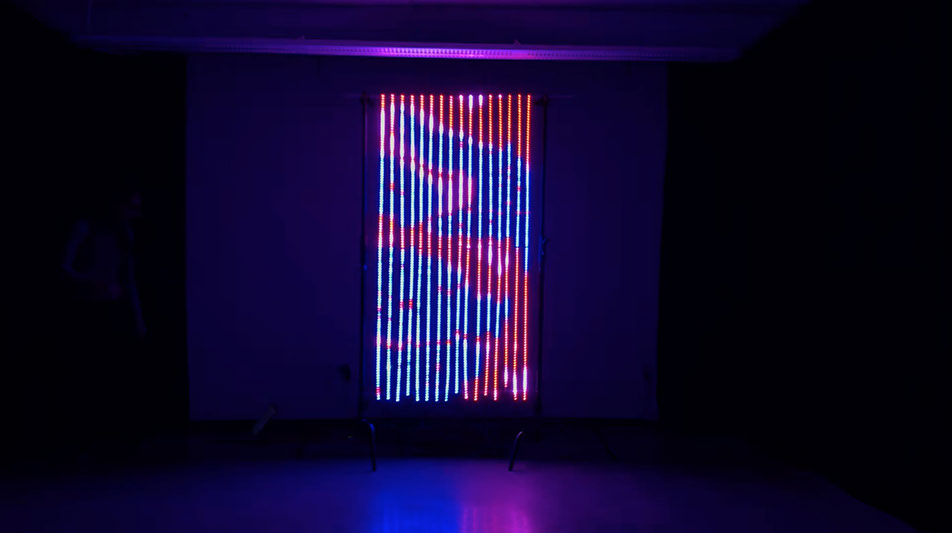 The artists opted for an army of programmable LEDs. They allow to create an arrangement that is easier for transportation and setup because it can fit into a duffle bag. For the show itself, moving away from a simple screen helps achieve a more immersive spectacle by intertwining the band and the lights, allowing the visuals to mix more seamlessly with the music rather than just accompany it. The modularity of both the physical structure and the software allows for new experiences to be created every show, for both audience and performer alike.